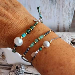 Bracelet composé d’une perle d’eau douce, de pierres semi-précieuses rubyzoisite, jaspe et hématite.
