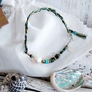 Fils tressés kaki, turquoise et doré, fermoir mousqueton et médaille en argent 925.